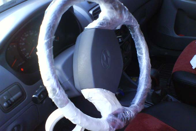 8. Аккуратно стягиваем изготовленный чехол и проверяем его фиксацию на рулевом колесе.